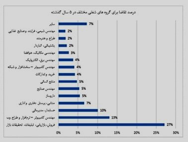 «مهندسی کامپیوتر نرمافزار و طراحی وب» با ۱۳ درصد در رده دوم مشاغل پر تقاضا در پنج سال گذشته قرار دارد. همچنین دادهها نشان میدهد با وجود رکود کلی بازار کار بر اثر بحران اقتصادی، تقاضا برای این گروه شغلی رشدی ۱۴ درصدی را در فاصله سالهای ۲۰۱۷ و ۲۰۱۸ تجربه کرده است.